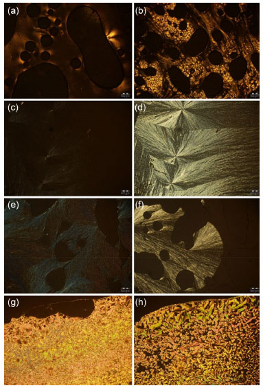 ![]() Figura 6. Texturas visualizadas sob microscopia ótica de luz polarizada para as misturas do bloco 2. Em (a) é mostrado líquido viscoso e birrefringente de UR1 no resfriamento; (b) cristalitos dispersos formados no resfriamento na amostra UR1 birrefringente; (c) textura da mistura UR2 obtida no resfriamento; (d) textura da mesma mistura com a formação do padrão de esferulitas; (e) cristais de UR3 no resfriamento; (f) início da cristalização da UR3 a partir do estado isotrópico em 169 °C; (g) textura focal cônica borrada da mesofase SmC para a UR4 em 192 °C, e em (h) textura focal cônica da mesofase SmA em 213 °C, para a UR4