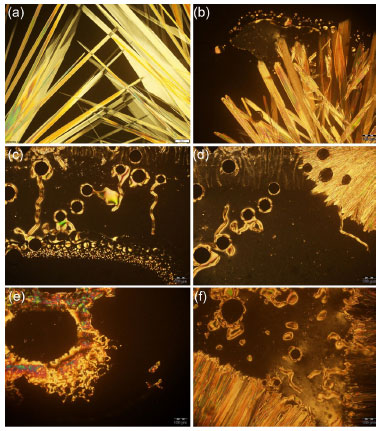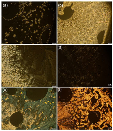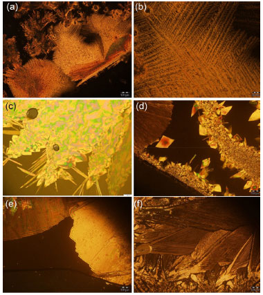 ![]() Figura 9. Texturas visualizadas sob microscopia ótica de luz polarizada para as misturas do bloco 4. Em (a) mistura UR11 abaixo de 50 °C com crescimento circular e dendríticas com objetiva de 10×; (b) visualização da textura dendrítica com objetiva de 40×; (c) crescimento dos cristais da fase cristalina no resfriamento da amostra binária UR12; (d) formação dos cristais da mistura binária UR13 a 44 °C; (e) cristalização a 45 °C da amostra binária UR14; e em (f) e cristalização completa à temperatura ambiente da mesma amostra