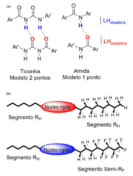 ![]() Figura 10. (a) Interações LH de diariltiouréias e diarilamidas; (b) combinação de segmentos de cadeias hidrogenadas (RH) flexíveis e cadeias semirígidas semiperfluoradas (RF)
