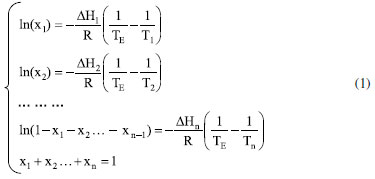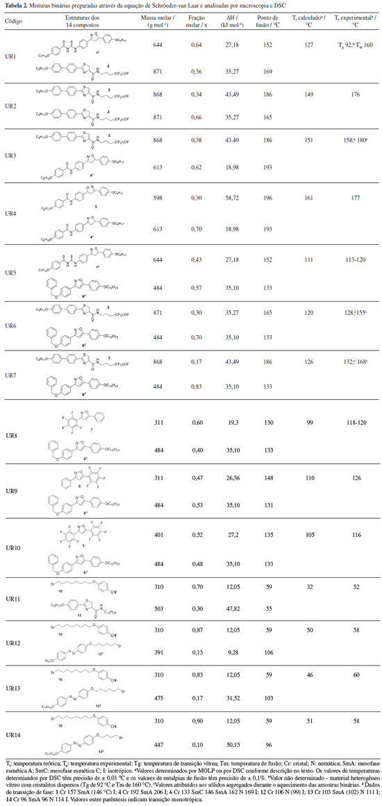Ursula Paôla Rudolph de MatosI,II; Luana Dezingrini LopesI; Ana Paula ScheerenI; Juliana Maria Forain Miolo SchneiderIII; I. Instituto de Química, Universidade Federal do Rio Grande do Sul (UFRGS), 91501-970 Porto Alegre - RS, Brasil Recebido: 23/09/2023 *e-mail: itamar3141@yahoo.com.br; aloir.merlo@ufrgs.br The Schröeder-van Laar equation to predict the theoretical eutectic melting temperature values was applied to a set of fourteen binary mixtures (UR1 to UR14). The fourteen binary mixtures belong to a structurally diverse group of organic molecules. They are represented by the 5-membered heterocycles containing N-S and N-O rings, flexible methylene chains (RH), semi-rigid semi-fluorinated chains (RF), and hydrogen bonds (HB). A virtual screening totalizing ninety-one possible theoretical combinations was planned. The UR1 to UR14 were prepared by mixing individual components using the calculated mole fractions. The experimental (Te) and theoretical (Tt) temperatures for the eutectic melting points were determined using polarized optical microscopy (POM) and differential scanning calorimetry (DSC) techniques. Heterogeneous mixtures were formed for components with large structural diversity as seen by POM. During the melting of the mixtures, irregular behavior through the segregation of the components was recorded. The study showed that the similarities in structural diversities favor the formation of homogeneous mixtures, with Te values approaching Tt, as predicted by the Schröeder-van Laar equation and by the theory of eutectic mixtures. Liquid crystal properties were affected in homogeneous binary mixtures containing one of the individual liquid crystal components. INTRODUÇÃO O estudo de substâncias puras e de misturas é de fundamental importância para a compreensão de propriedades físico-químicas e estruturais básicas visando uma posterior aplicabilidade tecnológica. As substâncias puras são formadas por um único constituinte ou componente, enquanto as misturas são formadas por duas ou mais substâncias. As misturas podem ser diferenciadas pela observação da formação de uma fase (mistura homogênea) ou duas ou mais fases (mistura heterogênea). As propriedades das misturas heterogêneas não são iguais em sua extensão, com a formação de uma fronteira que delimita as propriedades individuais de cada uma das substâncias, denominada de interface. Elas apresentam descontinuidades na interface entre as substâncias que formam a mistura, formando sistemas bifásicos, trifásicos, etc. As misturas homogêneas apresentam-se uniformes em uma única fase e são visualmente indistinguíveis de uma substância pura. Por exemplo, o álcool etílico 96% constituído de 96% de álcool e 4% em volume de água é visualmente indistinguível de um copo com água destilada líquida ou de um litro de álcool anidro, constituindo assim sistema monofásico. As propriedades físicas, ópticas entre outras espelham essas diferenças. Assim, uma solução de álcool etílico 96% é opticamente indistinguível do líquido puro água ou do álcool etílico. No entanto, as propriedades físicas, como a densidade, temperaturas de ebulição e de fusão, índice de refração, etc., são diferentes da mistura e dos constituintes puros isolados. Particularmente interessante é avaliar o comportamento térmico de misturas homogêneas e/ou heterogêneas durante o processo de destilação ou de fusão da mistura. Substâncias puras apresentam valores constantes da temperatura de fusão e ebulição durante a transição da fase sólida para a fase líquida e da fase líquida para a fase gasosa. Na transição de fase, as temperaturas de fusão e de ebulição permanecem constantes, coexistindo no equilíbrio ambos o sólido e o líquido durante a fusão e líquido e o vapor durante a ebulição. Entretanto, existem exemplos de misturas homogêneas ou heterogêneas que durante a transição de fase apresentam um comportamento misto de substância pura e de mistura, denominados de misturas azeotrópicas e eutéticas. Assim, misturas azeotrópicas são definidas como sendo formadas por líquidos cuja proporção não pode ser alterada pela simples destilação, pelo fato de apresentar a mesma temperatura de ebulição. Quando um azeótropo é destilado, o vapor do destilado e a mistura líquida não destilada é constituída da mesma proporção dos seus constituintes.1 Para misturas sólidas homogêneas, a definição de mistura eutética é usada e refere-se a uma mistura homogênea formada por dois ou mais constituintes cuja temperatura de fusão se mantém constante enquanto existir o equilíbrio entre as fases sólida e líquida. Durante a fusão de uma mistura eutética a temperatura observada de fusão será menor do que a dos constituintes individuais que formam a mistura.2 Misturas azeotrópicas e eutéticas apresentam aplicabilidade em muitos processos e procedimentos experimentais. Processos de destilação são governados pelas pressões parciais dos componentes individuais e pela pressão total resultante da soma das pressões parciais de cada componente. Como exemplos amplamente utilizados em experimentos demonstrativos e em sala de aula, pode-se citar a extração de óleos essenciais usando destilação por arraste de vapor, que é uma das formas da utilização do azeótropo heterogêneo formado entre água e óleo essencial extraído de cascas de frutas ou temperos, a destilação do vinho que coleta diferentes frações de etanol e água para quantificar o álcool na mistura, etc.3 Solventes eutéticos profundos (SEP)4 são exemplos de misturas eutéticas com grande potencial de uso em processos de extração de metais preciosos, em catálise orgânica,5 em processos de recuperação de baterias de lítio,6 captura de dióxido de carbono,7 entre outras. Na área farmacêutica a formulação de misturas contendo um ingrediente farmacêutico ativo (IFA) e um componente molecul