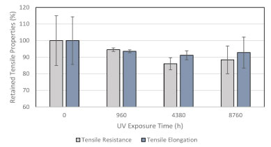 ![]() Figure 2. Retained tensile test results (resistance and elongation at break) compared with virgin sample test result after UV fluorescent exposure