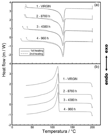 ![]() Figure 5. DSC curves: (a) melting point (heating) stage and (b) crystallisation (cooling) stage. (1) Virgin sample; (2) 8760 h UV fluorescent sample; (3) 4380 h UV fluorescent sample; and (4) 960 h UV fluorescent sample