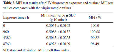 The characterisation results of the sample showed non-compliance with the American standard for the HP OIT test results, since the minimum HP OIT value required is 400 min. However, the HP OIT test result was approximately 70% of the minimum value required, showing the additive package of the sample probably has no HALS. Moreover, the tensile elongation test result showed a high standard deviation. MFI test results Table 2 shows the MFI test results for both virgin and UV fluorescent exposure samples after 960, 4380, and 8760 h and Figure 1 displays the behavior of the samples after exposure, exhibited in retained MFI results.
