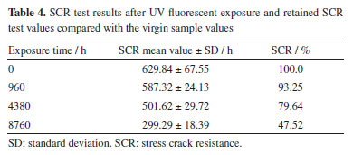 Firstly, the virgin sample showed a high standard deviation due to a 39.25 kN m-1 tensile resistance at break and a 596.50% tensile elongation at break of the specimen. The tensile resistance at break results decreased 5.48, 13.97, and 11.60%, respectively, for 960, 4380, and 8760 h UV exposure, compared to the virgin sample. On the other hand, the tensile elongation at break decreased 6.44, 8.85, and 7.20%, respectively, for 960, 4380, and 8760 h UV exposure compared to the virgin sample. The slight increase in the tensile properties' values between 4380 and 8760 h can be attributed to a variation in the manufacturing process. Koerner et al.39 exposed a 1.5 mm-thick HDPE geomembrane for 28,000 h using a UV fluorescent weatherometer. The sample showed an approximately 20% higher decrease in the tensile properties (resistance and elongation) in comparison to the present study. Lavoie et al.40 analyzed a 1.0 mm-thick HDPE geomembrane after 8760 h of UV fluorescent exposure and reported an approximately 30% decrease in both resistance and elongation tensile values during the exposure times. The sample analyzed in the present study showed lower decreases in the tensile properties values after UV exposure, hence, a better behavior. SCR test results Table 4 shows the SCR test results for both virgin and UV fluorescent exposure samples after 960, 4380, and 8760 h and Figure 3 displays the behavior of the sample after exposure, exhibited in retained SCR.