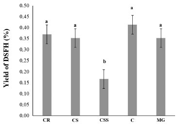 ![]() Figure 1. Average yield of Protium ovatum leaf dichloromethane soluble fraction of hydrolate (DSFH) from physiognomic types of the Cerrado of Goiás, Brazil. CR: Campo Rupestre; CS: Campo Sujo; CSS: Cerrado stricto sensu; C: Cerradão; MG: Mata de Galeria. Bars followed by the same letters are not significantly different by Tukey's test at 5% probability