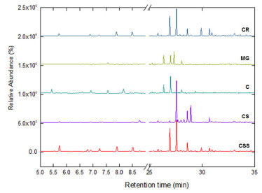 ![]() Figure 2. GC-MS chromatogram of chemical constituents of Protium ovatum leaf dichloromethane soluble fraction of hydrolate (DSFH) from physiognomic types of the Cerrado of Goiás, Brazil. CR: Campo Rupestre; CS: Campo Sujo; CSS: Cerrado stricto sensu; C: Cerradão; MG: Mata de Galeria