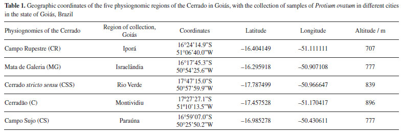 EXPERIMENTAL Plant materials Leaves of P. ovatum were collected from five different regions characterized by the Cerrado physiognomy in the State of Goiás, Brazil, in June 2017 (Table 1). The identification was made by the biologist Erika Virgínia Estefâne de Jesus Amaral. Plant specimens were deposited in the Herbarium of the Instituto Federal de Educação, Ciência e Tecnologia Goiano, Campus Rio Verde, accession number 628.