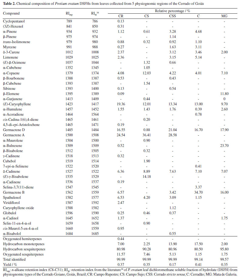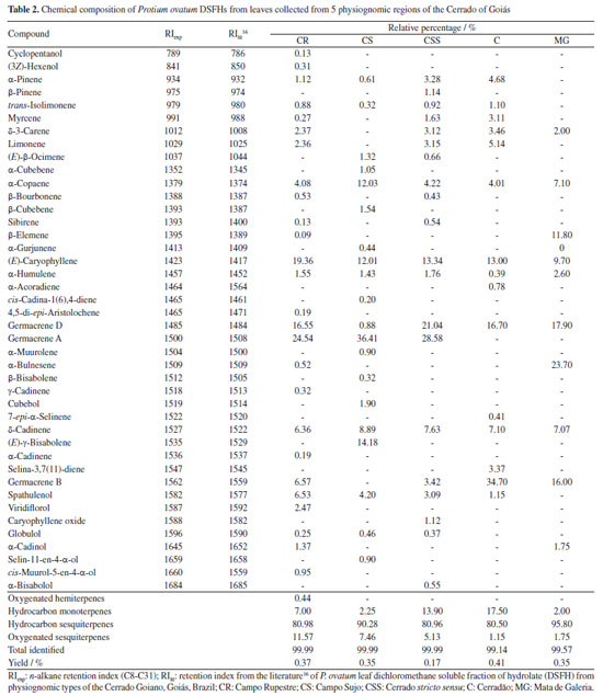 RESULTS AND DISCUSSION The yield of DSFHs leaves of P. ovatum from the CSS region differed significantly from the other physiognomies investigated (average yield of 0.17 ± 0.06%) (Figure 1). The oil essential from P. ovatum leaves collected in the Cerrado region at the Universidade de Rio Verde (UniRV), in Rio Verde, Goiás, Brazil (17º 47'53"S and 50º 55'41" W) in July 2015 yielded 0.3%,6 which is higher than the percentage found in this study developed with the same species (physiognomie CSS). The other physiognomies showed higher performance than previously reported.6 The variations of yield in DSFH may be related to edaphic factors such as geomorphological formations and soil fertility, which vary according to the vegetation physiognomy.23