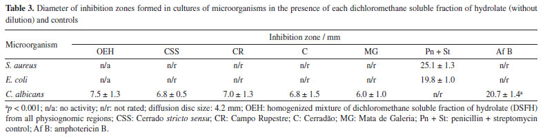 Dichloromethane soluble fraction of hydrolate (DSFH) from the four Cerrado physiognomies showed fungicide activity against C. albicans, with an inhibition zone of 6.0 to 7.0 mm. The best result was presented for the mixture of oils OEH (7.5 mm) (Table 3). These results corroborate the data presented by Carvajal et al.,26 where essential oils of P. colombianum showed cytotoxicity against Fusarium isolates. The antifungal and antimicrobial properties of EOs from aromatic plants have, in some cases, been explained in terms of their main constituents, but in other cases, it was found that the activity of the EO cannot be easily correlated with any individual component, but by a mixture of compounds, which reflect the higher antimicrobial activity of the whole EO than the major constituents do when tested separately.33 The lipophilic character of the EOs is directly related to the antimicrobial action.34 According to Oliveira et al.,35 essential oils modify the permeability of the fungal cell membrane, allowing solutes into the cell and affecting its osmotic balance. This process can lead to decreased cytoplasm content and loss of important ions and proteins, ultimately causing cell damage and death.36 Essential oils of trees from the genus Boswellia (Burseraceae) were analyzed by gas chromatography coupled with mass spectrometry. The components identified and their range in the oils include α-pinene (2.0-64.7%), α-thujene (0.3-52.4%), β-pinene (0.3-13.1%), myrcene (1.1-22.4%), sabinene (0.5-7.0%), limonene (1.3-20.4%), p-cymene (2.7-16.9%) and β-caryophyllene (0.1-10.5%). The antimicrobial activity (minimum inhibition concentration assay) of the oils was investigated against five reference test organisms and the activity ranged from 4-16 mg mL-1 (S. aureus); 1.5-8.3 mg mL-1 (Bacillus cereus); 4.0-12.0 mg mL-1 (E. coli); 2.0-12.8 mg mL-1 (Proteus vulgaris) and 5.3-12.0 mg mL-1 (C. albicans).37 These results corroborate those presented for C.albicans; however, the essential oils were not tested separately for S. aureus so that the comparison could be made. Therefore, this study shows promising results for the antioxidant and antifungal potential of the DSFH of P. ovatum.