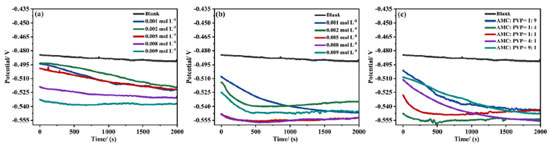 Figure 2. The OCP variation of lowcarbon steel exposed to 20% HAc solution containing 600 mg L-1 chloride ions with different concentrations of AMC (a), PVP (b) and AMC + PVP combination inhibitor (c) at 25 °C