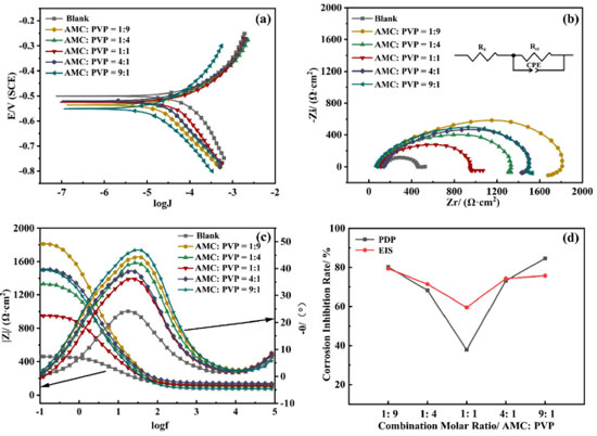 The corrosion inhibition performance of AMC + PVP combination inhibitor Figure 6 shows the electrochemical test results of the AMC + PVP combination inhibitor, the PDP and EIS fitting parameters are listed in Tables 3 and 4, respectively. As can be seen from Figure 6a and Table 3, the ba and bc also change evidently and the maximum change of Ecorr is less than 85 mV, indicating that the AMC + PVP combination inhibitors still behave as a mix-type inhibitor.33 The Jcorr increases with the close of the combination molar ratio, indicating that the performance of AMC + PVP combination inhibitor decreases with the close of the combination molar ratio. Especially, when AMC and PVP are combined with the molar ratio of 1:1, the corrosion inhibition rate reaches the lowest of 37.95%. It is worth noticing that a small amount of PVP promotes the corrosion inhibition performance of AMC. The corrosion inhibition rate increases from 61.22 (the best inhibition rate of AMC used alone) to 84.69% (the combination molar ratio AMC:PVP = 9:1). However, the small amount of AMC almost not affect the corrosion inhibition effect of PVP, the corrosion inhibition rate changes from 79.21 (the best inhibition rate of AMC used alone) to 80.20% (the combination molar ratio AMC:PVP = 1:9). The EIS results listed in Figures 6b, 6c and Table 4 also show the same regularity. Both the capacitive loop radius (Figure 6b) and the impedance modulus in low-frequency (Figure 6c) decrease with the combination molar ratio close, illustrating the reducing of the Rct and corrosion inhibition rate. When the AMC and PVP combination ratio is 1:1, the capacitive loop exhibits the smallest radius and the impedance modulus shows the lowest value except the blank solution, which represent the AMC + PVP combination inhibitor has the worst corrosion inhibition at this combination ratio. While when the AMC:PVP combination ratio is 1:9, the capacitive loop shows the largest radius and the impedance modulus exhibits the maximum value, indicating the best corrosion inhibition at this combination ratio. In addition, there is still only one peak in the phase angle after the AMC and PVP combining (Figure 6c), indicating that the solution system still has only one time constant. Figure 6d shows the consistency of the variation in the corrosion inhibition rate obtained by the PDP and EIS method.