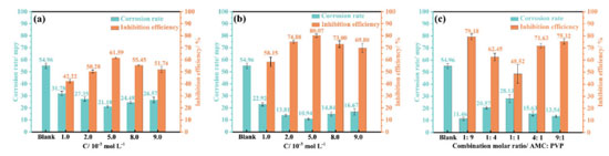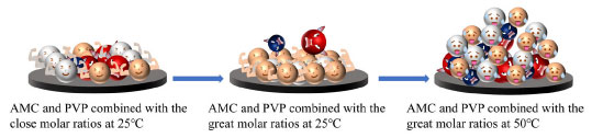As seen in Figure 13, both the AMC and PVP molecules possess a high steric hindrance, so they cannot compensate the voids after adsorption each other when they are combining used at close molar ratios (e.g., 1:1). Therefore, the adsorption film is defective tightness when the AMC and PVP are combined with a close molar ratio, which leads to a poor corrosion inhibition. When the AMC and PVP are combined with a great molar ratio of 1:9 or 9:1, the few amounts of AMC or PVP compensates the vacant at the adsorption of the other, thus improving the corrosion inhibition rate. The solution system internal energy is increased with the temperature increasing, leading to an intensification of molecular thermal motion. The adsorption energy of AMC + PVP combination inhibitor on the mild steel surface does not offset the kinetic energy of the molecular thermal motion. As a result, the adsorption film becomes unstable (Figure 13), leading to a reduction in corrosion inhibition effectiveness.