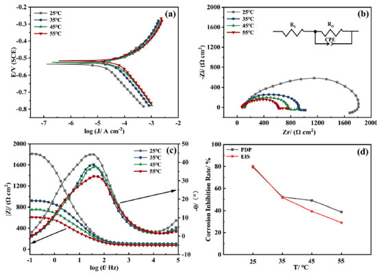 Effect of temperature on the AMC + PVP combination inhibitor To investigate the effect of temperature on the AMC + PVP combination inhibitor, the lowcarbon steel working electrode are tested in various temperatures solution by PDP and EIS methods. The molar ratio of AMC + PVP combination inhibitor is AMC:PVP = 1:9. The results are presented in Figure 8, Tables 6 and 7. As can be seen from Figure 8a, the cathodic and anodic branches of polarization curve at all temperatures are close to parallel, indicating that the temperature change do not affect the corrosion mechanism of lowcarbon steel.44 According to Table 6, the Jcorr increases gradually with the rise of temperature, indicating that more electrons pass through the electrode surface. Figures 8b and 8c show the gradually decrease of the capacitive arc radius and the impedance modulus with the increasing temperature, indicating the reduction of the adsorb layer density and uniformity on the steel surface. Table 7 shows the values of Rct decrease with the rise of temperature, indicating the increasing temperature result the instability of adsorb layer. Therefore, the corrosion inhibition rate decreases with rising temperature. Moreover, the phase angle in Figure 8c still shows only one peak, indicating that the corrosion inhibition system at different temperatures has only one time constant, further proving that the temperature change does not affect the corrosion mechanism of mild steel. As can be seen from Figure 8d, the corrosion inhibition rates obtained by the PDP and EIS methods exhibit a large decrease with the increasing temperature, from 79.37 and 80.20% at 25 ºC to 38.74 and 29.07% at 55 ºC, respectively.