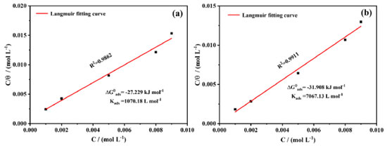 Figure 9. The Langumir adsorption curves of lowcarbon steel immersed in corrosion solution at 25 ºC: (a) adding AMC and (b) adding PVP