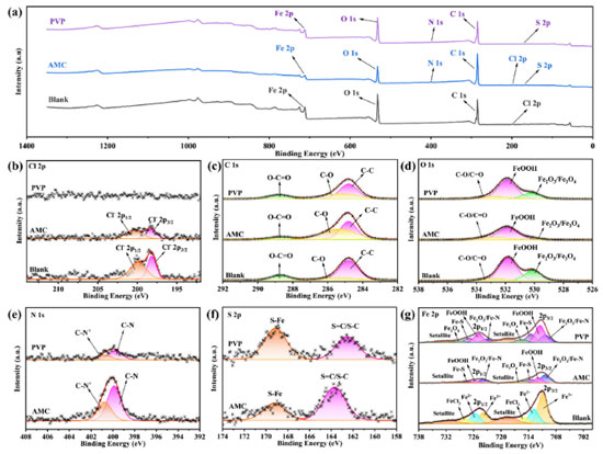 Figure 10. XPS of lowcarbon steel immersed in corrosion solution without and with different inhibitor at 25 ºC: survey (a) and high-resolution (b) Cl 1s, (c) C 1s, (d) O 2p, (e) N 1s, (f) S 2p, (g) Fe 2p