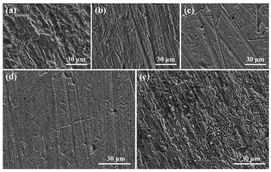 ![]() Figure 11. SEM images after lowcarbon steel immersed in corrosion solution: (a) without inhibitors at 25 ºC, (b) with 5.0 × 10-3 mol L-1 AMC at 25 ºC, (c) with 5.0 × 10-3 mol L-1 PVP at 25 ºC, (d) with 1.0 × 10-3 mol L-1 AMC and 9.0 × 10-3 mol L-1 PVP at 25 ºC, and (e) with 1.0 × 10-3 mol L-1 AMC and 9.0 × 10-3 mol L-1 PVP at 50 °C
