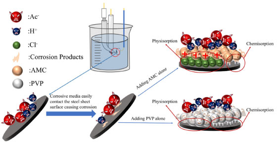 ![]() Figure 13. Corrosion inhibition mechanism of AMC and PVP combined use