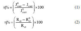 Tests and characterization In this study, a three-electrode system with a saturated calomel electrode (type 232) as the reference electrode, a platinum electrode as the auxiliary electrode and a working electrode made of lowcarbon steel were connected to a CS350 electrochemical workstation for the electrochemical measurement. Before measurement, the working electrodes were polished brightly with 100, 600, 800 and 1000 grit sandpaper, and then degreased the polished working electrode with an acetone solution. Subsequently, the three-electrode system was soaked in the measurement solution for 2 h to stable the open circuit potential (OCP). After the OCP test, the potentiodynamic polarization (PDP) test was scanned in the range of ± 250 mV (E vs. SCE) at a scan rate of 0.5 mV s-1. Following, the electrochemical impedance spectroscopy (EIS) test was performed in the frequency range of 100 kHz to 0.01 Hz with an amplitude of 10 mV. The PDP and EIS data were fitted with Cview2 and Zview2 software, respectively. The corrosion inhibition rate (h%) is calculated by Equations 1 and 2.24 ![]() where the and Jcorr represent the current densities without and with corrosion inhibitors, and Rct are the charge transfer resistance without and with corrosion inhibitor, respectively. For weight loss measurements, three parallel pieces of 10 mm × 10 mm × 2 mm lowcarbon steel were polished with 100, 600, 800 and 1000 grit sandpaper and then washed with ethyl alcohol ultrasonic. After drying and weighing accurately, the samples were hung in the corrosion solution with different inhibitors and concentrations at 25 ºC. The ethyl alcohol ultrasonic was used to clear the lowcarbon steel sheets after the samples were immersed for 24 h. Subsequently, the samples were dried and re-weighed accurately again. The average weight loss was applied to evaluate the corrosion rate (mpy) according to Equation 3:25 ![]() where K represents a constant whose value is 3.16 × 106, W represents the weight loss (g), A, t, r represent the exposed area (cm2), the immersion time (h) and the density of lowcarbon steel (7.85 g cm-3), respectively. Equation 4 had been used to calculate the corrosion inhibition efficiencies (h%). ![]() where V0 and V1 represent the corrosion rate of without and with inhibitors, respectively. The surface compositions of lowcarbon steel immersed in corrosion solutions with different mediums at 25 ºC for 24 h were acquired by X-ray photoelectron spectroscopy (XPS, PHI5000 Versaprobe-II). The morphologies of samples were observed by scanning electron microscope (SEM, Nova 450, FEI) after ultrasonic clear the steel sheets which were immersed in corrosion solutions with different mediums and temperature for 24 h.