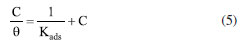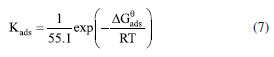 Adsorption model To explore the adsorption information of the AMC and PVP on mild steel electrodes, the Langmuir adsorption curve is treated with a regression of C/θ-C to describe the adsorption of the AMC and PVP inhibitors. The adsorption isotherm is as follows:45 ![]() where C, Kads, and θ are the corrosion inhibitor concentration, adsorption equilibrium constant, and surface coverage, respectively. The θ is calculated from Equation 6:35 ![]() As can be seen from Figure 9, the Langmuir adsorption curves fit the data well, indicating that the adsorption of both the AMC and PVP drugs on mild steel surface is consistent with the Langmuir adsorption model. The corrosion inhibitor molecules form a single molecular adsorption layer on the mild steel surface, which effectively alleviates the corrosion of mild steel. The standard free energy of adsorption is calculated from Equation 7:35