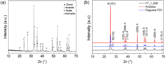 ![]() Figure 1. XRD patterns for (a) ilmenite and (b) synthesized Fe-TiO2 (FT_1_600), reference anatase and commercial Degussa P25. A: anatase; R: rutile