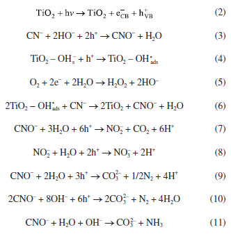 Mechanistic aspects The primary process after UV radiation absorption by the photocatalyst is the electron/hole pairs (e-/h+) photogeneration, as it is shown in the Equation 2.2 The cyanide photo-oxidation by TiO2 may occur through direct charge transfer with the photogenerated holes (h+) (Equation 3) or an indirect pathway with the adsorbed or diffused hydroxyl radicals (OH) by the aqueous medium (Equation 4). If the reaction is accompanied by O2, the oxygen might act as an electron scavenger and reacts with the photogenerated electrons (Equation 5).41 It is accepted that the photodegradation mechanism of cyanide implies the oxidation of CN- to CNO-, through either photogenerated holes (Equation 3) or hydroxyl radicals (OH) (Equation 6).42,43 ![]() Depending on the oxidizing conditions, cyanate can undergo further oxidation to different subproducts.42,44 Auguglario et al.42 say that the addition of oxygen or air to the reaction medium determine the mild oxidation conditions, and as consequence the formation of volatile nitrogen-containing species (such as NH3, N2, N2O, etc.) is promoted together with generation of nitrite (NO2-) and nitrate (NO3-) ions. Under strong oxidizing conditions, such as those with large amounts of H2O2, volatile nitrogen-containing species are not produced, or they are quickly photo-oxydized to NO2- and NO3- as it was observed in the Equations 7 and 8. All the possible reactions of cyanate oxidation were described in Equations 7-11. In this work, air was employed as O2 source and the photocatalytic oxidation occurs in aqueous medium. Therefore, it is expected the oxidation of cyanide to cyanate, and even a further oxidation to volatile species such as it was mentioned above. The possible mechanism of photo-oxidation of cyanide under current conditions could be represented by Equations 2-11 described above, except for the Equations 7 and 8, which can occur only under strong oxidizing conditions. CONCLUSIONS This work demonstrates the viability for obtaining an Fe-doped TiO2 photocatalyst by acid treatment of natural ilmenite powders from alluvium gold mining wastes. The characterization by XRD allows determining the crystalline phase of the synthesized solid, which corresponds to anatase structure. All the characterizations performed on the sample suggested that the synthesized Fe-TiO2 was doped with a small quantity of iron. This result was verified by XRF, XRD and XPS. Regarding the experimental design (Box-Behnken Design), it is worth mentioning that although the optimized model is not enough adjusted (R2 = 0.81) for the selected factors and levels, the studied parameters were well correlated. The photocatalytic reactions, under optimized conditions, showed important conversions of cyanide for Fe-TiO2, TiO2 anatase and Degussa P25 (32, 32 and 88%, respectively). These results suggest that the catalyst Fe-TiO2 obtained from the natural ilmenite exhibits a similar photoactivity to that of TiO2 (anatase) used as reference. Although TiO2 Degussa P25 is more active under UV irradiation, the obtained results with Fe-TiO2 are promising because this catalyst was synthesized from mining wastes. Finally, according to the band-gap of the solid Fe-TiO2, this material can be evaluated under visible irradiation, with potentially better results in the reaction of cyanide in diluted aqueous medium.