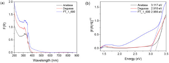 ![]() Figure 2. (a) UV-Vis diffuse reflectance spectra and (b) Tauc plots for indirect transition and band gap energies for synthesized Fe-TiO2 (FT_1_600), commercial anatase and TiO2 Degussa P25