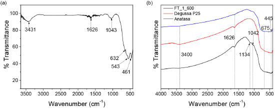![]() Figure 3. Infrared spectra for the (a) ilmenite concentrated from mining waste and (b) synthesized Fe-TiO2 (FT_1_600) and the commercial reference (anatase and TiO2 Degussa P25)