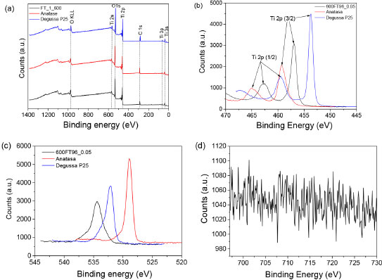 ![]() Figure 4. XPS analyses for synthesized Fe-TiO2 (FT_1_600), commercial anatase and TiO2 Degussa. (a) Comparison of the survey spectra, (b) high resolution spectra of Ti2p, (c) high resolution spectra of O1s and (d) XPS position of high resolution spectra for FeIII in the Fe-TiO2 (FT_1_600)