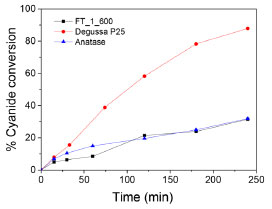 ![]() Figure 5. Photocatalytic degradation of cyanide (% cyanide conversion as a function of UV-light irradiation time) by Fe-TiO2 synthesized in the present work and the reference materials (commercial anatase and TiO2 Degussa P25). Experimental conditions: catalyst load = 0.6 g L-1, [CN-]0 = 50 ppm, pH = 10, Temperature = 20 °C