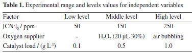 Furthermore, in order to compare the photocatalytic performance of the Fe-TiO2 synthetized with respect to commercial references (anatase and Degussa P25) after the optimization, a set of experiments were performed under the same conditions. Photocatalytic experiments A semi-batch cylindrical reactor of glass opened to the atmosphere provided with a jacket loop containing water connected to a thermostat at 20 ºC was used for all photocatalytic reactions. All experiments were performed with a solution volume of 400 mL under constant UV irradiation with a 13 W low-pressure UV mercury lamp for 4 h and magnetic stirring (500 rpm). The external surface of the reactor was covered with aluminum foil to prevent the influence of sunlight. The light intensity of the lamp was measured using Parker's actinometer (9.04 × 1012 counts cm-3 s-1 which corresponds to 0.008 mW cm-2).20 Before starting the reaction, the system was maintained under constant stirring for 1 h in absence of light to reach the adsorption-desorption equilibrium. NaOH and moisture filters were installed in the air line previous to the reactor with the purpose to retain the CO2 and water contained in air. The air was bubbled into the solution with the UV lamp on. Aliquots of constant volume (3 mL) were taken at regular intervals of time and filtered (Millipore 0.45 µm) for cyanide quantification by CN- ion selective electrode (HI 4109 Hanna Instruments) and volumetric quantification with standard AgNO3 using the APHA method 4500-D.21 As mentioned above, the experimental parameters considered in this work were the initial concentration of cyanide, the load of catalyst and the oxygen supplier.