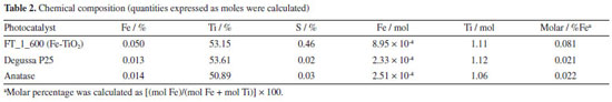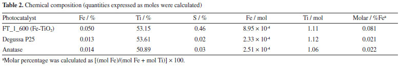 RESULTS AND DISCUSSION Characterization X-Rayfluorescence spectroscopy (XRF) The ilmenite obtained from black sands wastes from gold mining showed an important content of titanium (26.13% = 3.27 × 10-3 mol Ti g-1 of ilmenite) and iron (55.90% = 7.00 × 10-3 mol Fe g-1 of ilmenite) with minor quantities of zirconium (1.28%), manganese (1.23%), silicon (2.11%), aluminum (0.901%), and vanadium (0.512%) impurities. Table 2 shows the iron and titanium contents for the photocatalyst synthesized from ilmenite and for the references (commercial anatase and Degussa P25). As it can be seen, the resulting solid has a similar content of iron and titanium comparable to the commercial TiO2 Degussa P25. This indicates that the experimental conditions allowed a high extraction of titanium from the ilmenite concentrated from the mining waste. The quantity of iron incorporated in the synthesized Fe-TiO2 was appreciably low because of the efficient separation of ferrous sulfate crystallization step.22,23