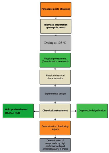 EXPERIMENTAL The research was carried out in the Applied Chemistry and General Chemistry laboratories of the Universidade Federal Rural do Semi-Árido, Campus Pau dos Ferros, Rio Grande do Norte, Brazil. Figure 1 presents the flowchart of the steps performed, from obtaining the biomass (pineapple peel) to the analysis of the sugars resulting from the process of saccharification of the material, through the chemical treatment applied.