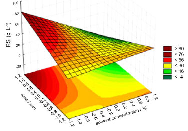 With the data in Table 5, it can be seen that the model is statistically significant, at the 95% confidence level, since the ratio of Fcalculated by Ftabled is equal to 1.70, and is above 1.0. Figure 3 shows the response surface of the influence of time and solvent concentration on the total reducing sugar content. Analyzing Figure 3, it is observed that the increase in time and the decrease in solvent concentration on the reducing sugars content, where operating at levels +1 and -1 for these variables, respectively, yields above 60% are obtained.