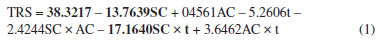 The data from the experimental design carried out with the pretreatment of the pineapple peel using organosolv in acid medium were analyzed using the Statistic 11.0 software14 and with the results, Equation 1 was obtained, which presents the regression model of the experimental data of the 2³ experimental design for the response concentration of RS in the liquid fraction. ![]() The coefficients presented in the regression in bold are the statistically significant ones at the 95% confidence level and SC, AC, and t represent the solvent concentration, acid concentration, and time, respectively. The determination coefficient (R2) of the regression model was 94.01%. Table 5 presents the ANOVA of the RS concentration-response.