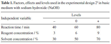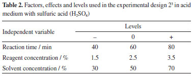 Characterization of dry and pretreated biomass The dried pineapple peel powder was then characterized in terms of lignin, alphacellulose and hemicellulose, based on the methodology of Morais et al.11 which was based on TAPPI standards. All these analyses were performed in triplicate to ensure greater reliability of the results obtained. Experimental design The pineapple peel biomass was submitted to chemical pretreatment experiments of organosolv delignification and acid pretreatment with sulfuric acid (H2SO4). This was a way used to break the cellular barrier, removing part of the lignin, extractives and hemicellulose, reducing the crystallinity of the structure and increasing the porosity of the material, in order to make the cellulose susceptible to hydrolysis. For the optimization of operational procedures in the process of pretreatment of the lignocellulosic material from the pineapple peel, and to allow the analysis of all possible combinations of the independent variables in order to obtain the best response in relation to the yield in the production of sugars from the saccharification of the material, a complete factorial experimental design and analysis of variance (ANOVA) were performed to determine the statistical significance of the response (p < 0.05). Delignification by the organosolv method was evaluated both in an acid medium using sulfuric acid (H2SO4) and in a basic medium using sodium hydroxide (NaOH). All tests were performed in triplicate, and results were reported as mean and standard deviation. The parameters chosen in this planning were treatment time (min), concentration of reagents (%), and concentration of solvents (%), keeping the temperature fixed at 121 ºC. Tables 1 and 2 show the values defined for the lower (-1) and upper (+1) levels, as well as for the central point (0) and the combinations of factors and levels used in each test, from according to the design matrix.