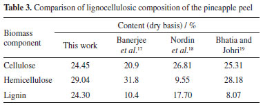 RESULTS AND DISCUSSION Chemical composition of pineapple peel The lignocellulosic characterization of the pineapple peel biomass aimed to know its composition in relation to the cellulose, hemicellulose and lignin contents, which are the most interesting components present in lignocellulosic materials, these contents are presented in Table 3. It is possible to observe a comparison with the content obtained by Banerjee et al.,17 Nordin et al.,18 and Bhatia and Johri.19