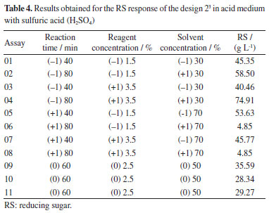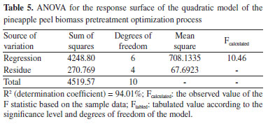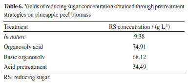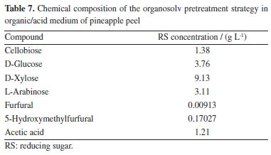 In terms of lignin, the pineapple peel showed values higher than those found by Banerjee et al.17 which was 10.4%, Nordin et al.18 which was 17.10% and as Bhatia and Johri19 which was 8.07%, where these authors used methods different from the one presented in this work. It is also verified that the cellulose and hemicellulose values found for the dried pineapple peel are close to those found by Bhatia and Johri19 when studying the pulverized pineapple peel, the composition value for cellulose was 25.31%, while for hemicellulose it was 28.18%. Hemicellulose is a heteropolysaccharide made up of pentoses (xylose, rhamnose and arabinose), hexoses (glucose, mannose and galactose) and uronic acids (4-O-methyl-glucuronic and galacturonic acids) and provides a more amorphous or non-crystalline nature than the crystalline cellulose polymer with glucose subunits. The amorphous structure of hemicellulose becomes more easily hydrolyzed than cellulose because it has around 100 to 200 sugar units.20 Due to the different ages and periods of biomass harvesting, there are differences in the fiber properties of the plant tissue and in the chemical composition. As the biomass matures, the lignin content increases while the holocellulose composition decreases, especially for amorphous hemicellulose. Evaluation of the experimental design The objective of this study was to fractionate the lignocellulosic biomass of the pineapple peel by the route that presented the best results in this work, that is, to disorganize the organic matrix to allow the hydrolysis step of the carbohydrates. After the organosolv process, the pretreated solid fraction (rich in cellulose - mass recovery) and the liquid fraction were separated. Table 4 presents the values of reducing sugars (RS) obtained for each test in the liquid fraction.