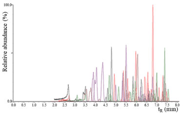 ![]() Figure 1. Total ion chromatogram obtained by UHPLC-MS/MS from a blank sample spiked with the analytes at 0.1 μg L-1