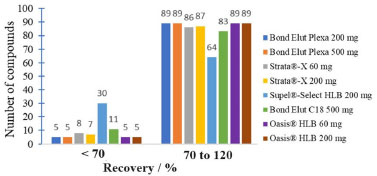 Establishment of the sample preparation conditions The evaluation of the Bond Elut Plexa 500 mg cartridge using ethyl acetate and dichloromethane as the elution solvent indicated that this condition is effective for most of the analytes evaluated. The evaluation of pH adjustment to 2.5 and without adjustment (pH 5.5 to 6.5) resulted in adequate recovery results for most of the compounds. Dichloromethane and ethyl acetate are not compatible with the UHPLC-MS/MS system and there is a need to evaporate the eluate and redissolve the analytes in an appropriate solvent. The evaporation stage makes the procedure more expensive, with risks of contamination of the final extract. Thus, it was evaluated the use of MeCN as elution solvent, which is compatible with the UHPLC-MS/MS system. MeCN improved the recovery of analytes due to its intermediate polarity.34 It allows the elution of analytes with a wide range of polarities and does not require an evaporation step, simplifying the procedure. In order to evaluate different SPE sorbents, eight types of cartridges with different amounts of sorbent were evaluated: Bond Elut Plexa 200 and 500 mg, Strata-X 60 and 200 mg, Supel-Select HLB 200 mg, Bond Elut C18 500 mg and Oasis HLB 60 and 200 mg. The number of compounds recovered for each cartridge is shown in Figure 2. MeCN was used as the elution solvent in all cases.