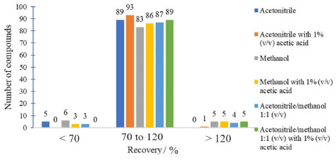 ![]() Figure 3. Comparison of elution solvents based on pesticide recoveries obtained by UHPLC-MS/MS