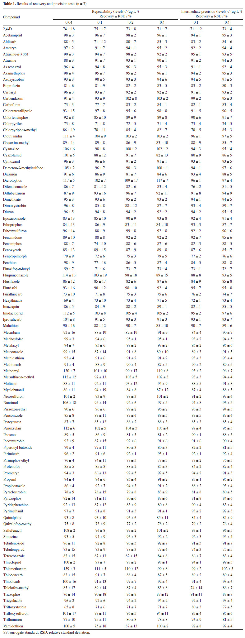 CONCLUSIONS The method proposed proved effective in determination of 94 current-use pesticides in various water samples, including drinking water, artesian well water, dam water, and river water. Through numerous tests conducted, the best sample preparation results were achieved using the SPE cartridge Oasis HLB (60 mg/3 mL) and MeCN with 1% v/v acetic acid as the elution solvent. Moreover, utilizing UHPLC-MS/MS with an electrospray ionization source in positive mode, operating in selected reaction monitoring mode, yielded satisfactory results in terms of detectability, selectivity, accuracy, and precision during the method validation phase. The linearity of the method was assessed within the range of 1-20 µg L-1, along with testing its precision and accuracy, which yielded satisfactory outcomes. Additionally, the limits of detection and quantification values obtained for the 94 CUPs were deemed acceptable compared to the maximum residue limits established by the European Union and Brazilian guidelines. The method was then applied to 12 different water samples, revealing that nine of the samples contained residues of one to four pesticides per sample, with concentrations of up to 2.24 µg L-1, thereby underscoring the significance of investigating pesticide residue levels in different types of water samples. In conclusion, our findings affirm that the proposed method exhibits high reliability in determining different classes of pesticides in water samples, showcasing its suitability for routine analysis and efficiency in conducting pesticide residue analyses at trace levels. The results that can be obtained with the application of the method will enable the generation of results that can guide measures to protect the environment and the population.