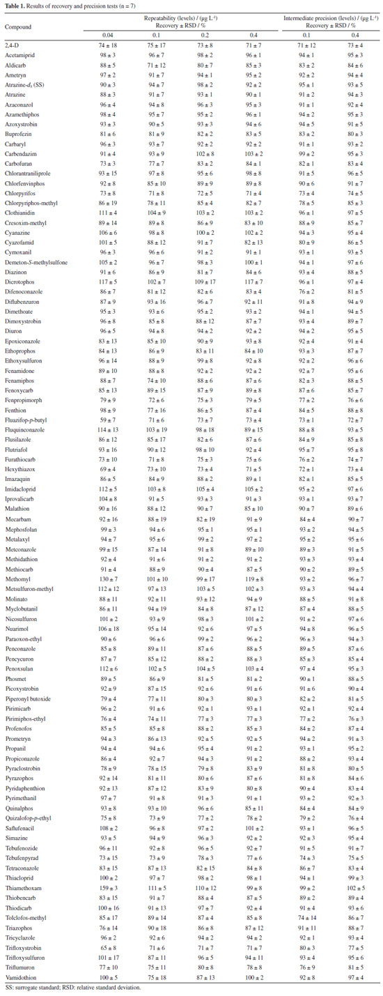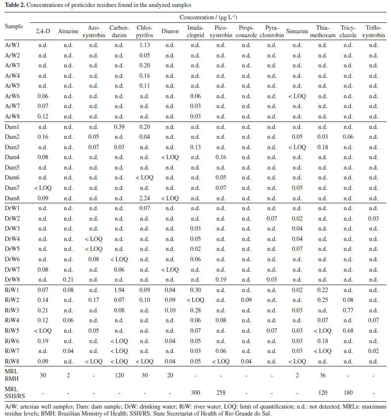 The accuracy and precision, in terms of repeatability and intermediate precision, presented acceptable results for most of the tests with recoveries between 71 and 117%, with RSD ≤ 19%. Except fluazafop-p-butyl, hexithiazoxy, methomyl, thiamethoxam and trifloxystrobin which showed recoveries outside the acceptable range at the level of 0.04 µg L-1. The LOD and LOQ of the method were 0.01 and 0.04 µg L-1, respectively, for most of the compounds analyzed. For fluazafop-p-butyl, hexithiazoxy, metomyl, thiamethoxam and trifloxystrobin the LOD and LOQ values, obtained considering the recovery and RSD values, were 0.03 and 0.10 µg L-1, respectively. These method limits were satisfactory regarding the limits establish in Brazilian and European standards. Thus, the developed method has great potential for laboratory routines and it can be used to perform determinations at trace levels analyses. Application of the method in water samples The validated method was applied for the determination of pesticide residues in 32 water samples from the Central Region of the Rio Grande do Sul State, Brazil. Eight samples of each different types of water samples (artesian well (ArW), dam (Dam), drinking water (DrW), and river water (RiW)) were analyzed. Table 2 shows the concentration values of pesticide residues for each sample. All the samples analyzed showed pesticide residues. The concentration values in the water samples are lower than the limits established in Ordinance GM/MS No. 88841 of the Brazilian Ministry of Health and Ordinance 32042 of the State Health Secretariat of Rio Grande do Sul for the 14 pesticides found. The concentrations of most of the pesticides were higher than the limits established by the European standards43 for drinking water. The results also showed that even with the treatment of the water distributed to the population, it still has pesticide residues, even though the concentrations found are below the limits of Brazilian legislation. SRM chromatogram of chlorpyrifos in drinking water samples and an artesian well sample overlaid on its LOQ (0.04 µg L-1) and the blank sample is available in Supplementary Material (Figure 1S).