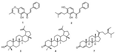 ![]() Figure 2. Chalcones, triterpenes, and steroids isolated from B. virgilioides roots. 1: Cordoin; 2: isocordoin; 3: lupeol; 4: lupenone; 7: stigmasterol