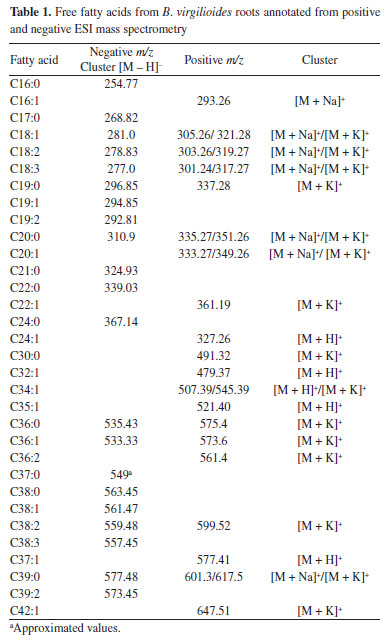 RESULTS AND DISCUSSION Analysis of the NMR and IR data of the first eluted fraction of the root extract of B. virgilioides indicated that it is composed of a mixture of free fatty acids. This conclusion was based on the absence of peaks of the oximethyne and oximethylenes hydrogens and carbons in the 1H and 13C NMR spectra of this mixture (Figure 1). Besides, the 13C NMR showed peaks of carboxylic acyl groups and olefinic carbons at d 181.0 and 127-131 ppm, characteristics peaks of carboxylic acids and unsaturated chains (Figure 1). The other peaks of the spectra and the integrals revel this mixture is composed mainly by linear saturated and unsaturated fatty acids, including very long fatty acids (VLFA). The ESIMS registered in positive and negative modes permitted tentatively identifying the composition, considering the biosynthetic pathway with the double bond in C-9. Comparing the molecular ions registered with linear chains of fatty acid, it was possible to propose the presence of C:16 to C:42 chains (Table 1). Fatty acids are ubiquitous, and as such, they belong to a physiologically important class of molecules involved in cell energy storage (e.g., adipose tissues), membrane structure, and various signaling pathways. VLFA are the fatty acids with more than C:18. Besides being involved as membrane constituents and signaling molecules in sphingolipids and phospholipids, they are also required in cuticular waxes and suberin formations, two extracellular biopolymers preventing plants from desiccation or external aggressions.19 However, the presence of free fatty acids is not regular in plants, and few studies deal with the presence of FFA and VLFA in plants. As examples, these classes of compounds were detected previously in sugar cane wax20 and in different peel variety grapes,21 and the authors infer they are produced by habitat stress, suggesting the FFAs are oxidative substrates by mitochondria and participate in various electron transfer pathways. It may be one of the adaptation mechanisms.22 Another role for these compounds is that plants have evolved strategies to prevent water loss under drought stress, and the increment of wax accumulation in leaves could enhance drought resistance.23