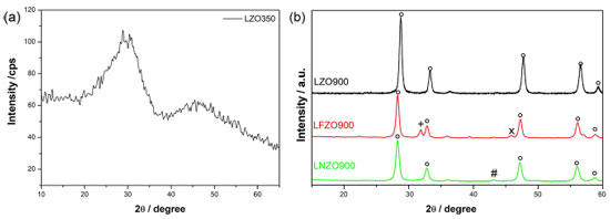 Figure 1. XRD patterns for (a) LZO350 and (b) LZO900, LFZO900 and LNZO900 materials. ○: La2Zr2O7; +: ZrO2; ×: La2O3; #: NiO