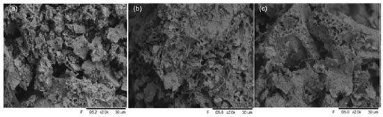 It is possible to observe that the three prepared materials presented very close average crystallite size values (of La2Zr2O7 phase), being 15 nm for LFZO and LNZO and 18 nm for LZO. These values of SSA and mean crystallite size are excellent results if compared with that data obtained from the literature22 that obtained the La2Zr2O7 material by the modified Pechini method with a mean crystallite size of 46.9 nm and surface area of 1.35 m2 g-1. This observation is important since the size of the crystallites is directly related to some properties of the materials, where materials with smaller crystallite sizes generally have a greater surface area, which facilitates the interaction of the adsorbent surface with the adsorbate.23 In the synthesis of the materials, collagen was used, which is a protein made up of amino acids and presents an amino and carboxyl group that are linked to the same carbon atom. In the FTIR spectra of the heat-treated and calcined material, the bands are compared with those of collagen (Figure 1S, Supplementary Material). The FTIR spectra for the LZO material heat treated at 350 °C and calcined at 900 °C (Figure 1S) indicate that after the heat treatment and calcination process it is still possible to notice a broad band in the region between 3500-3000 cm–1 referring to the stretching vibration of the O–H bond, and a band referring to N–H in the region between 1640 and 1550 cm–1. Furthermore, characteristic bands originating from collagen observed in the range of 1100 to 1640 cm–1 are attenuated in the materials after heat treatment and calcination, which may be an indication of the interaction between the ionic species present in the solution with species of the collagen structure, as shown in previously reported.4-6 In the spectrum of the material calcined at 900 °C, the stretching band of the M–O bond (close to 550 cm–1) was more evident when compared with the spectrum of the material heat-treated at 350 °C, which suggests that calcination at 900 °C leads to the formation of oxides. The results also showed in Table 1 indicate that the PZC values of the materials were close to 6. If the pH value of the PZC is greater than the pH value of the medium, the surface of the material becomes positively charged, which favors the adsorption of negatively charged particles, anionic species. Otherwise, there will be a tendency to adsorb positively charged species, cationic species.4,11,24 One of the mechanisms involved in the adsorption process is the electrostatic interaction that can occur between positively charged sites of the adsorbent material and negatively charged species present in the dye. When the pH increases, the number of these positively charged sites decreases, increasing the negatively charged sites and, consequently, reducing dye adsorption due to electrostatic repulsion.25 As the Congo Red dye is considered an anionic species, its adsorption will occur favorably when the pH of the medium is lower than the pH of the PZC. This fact was confirmed in preliminary tests, which revealed that the ability to remove Congo Red dye increased as the pH of the solution decreased. The SEM images (Figure 2) show that the prepared adsorbents present the formation of aggregated particles with irregular morphology and size variation. It is also possible to notice the presence of pores of different sizes in its structure. This may show a characteristic that favors the adsorption process.
