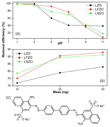 ![]() Figure 3. Removal efficiency of CR at (a) different pH of the medium and at (b) different adsorbent mass used; (c) structure of Congo Red compound