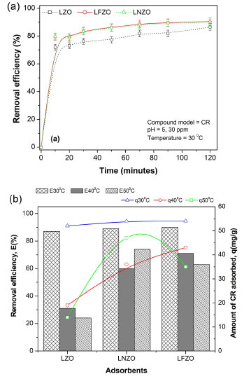 ![]() Figure 4. (a) Congo Red removal efficiency (E, in %) using LZO, LNZO and LFZO materials as a function of contact time; (b) amount of CR adsorbed (q, mg g–1) and E(%) at equilibrium time at different temperatures (30, 40 and 50 °C)