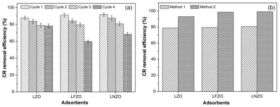 Figure 5. CR removal efficiency (%) using materials submitted to reuse in cycles (a) and comparison of CR removal efficiency (%) under materials using different recovery and reuse methodologies (b)