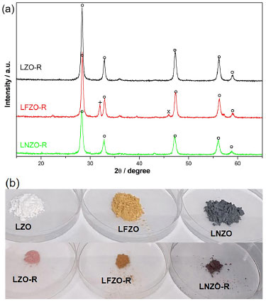 ![]() Figure 6. (a) XRD patterns of the recovered materials after adsorption tests, ○: La2Zr2O7; +: ZrO2; ×: La2O3; (b) image of the materials as synthesized and recovered